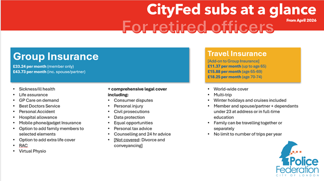 Please complete Group Insurance Application for Retirees if you are a retiring officer already subscribing to the City of London Police Federation Group Insurance scheme as a serving officer and wish to continue with your cover. This form also contains an option add retiree Travel Insurance.