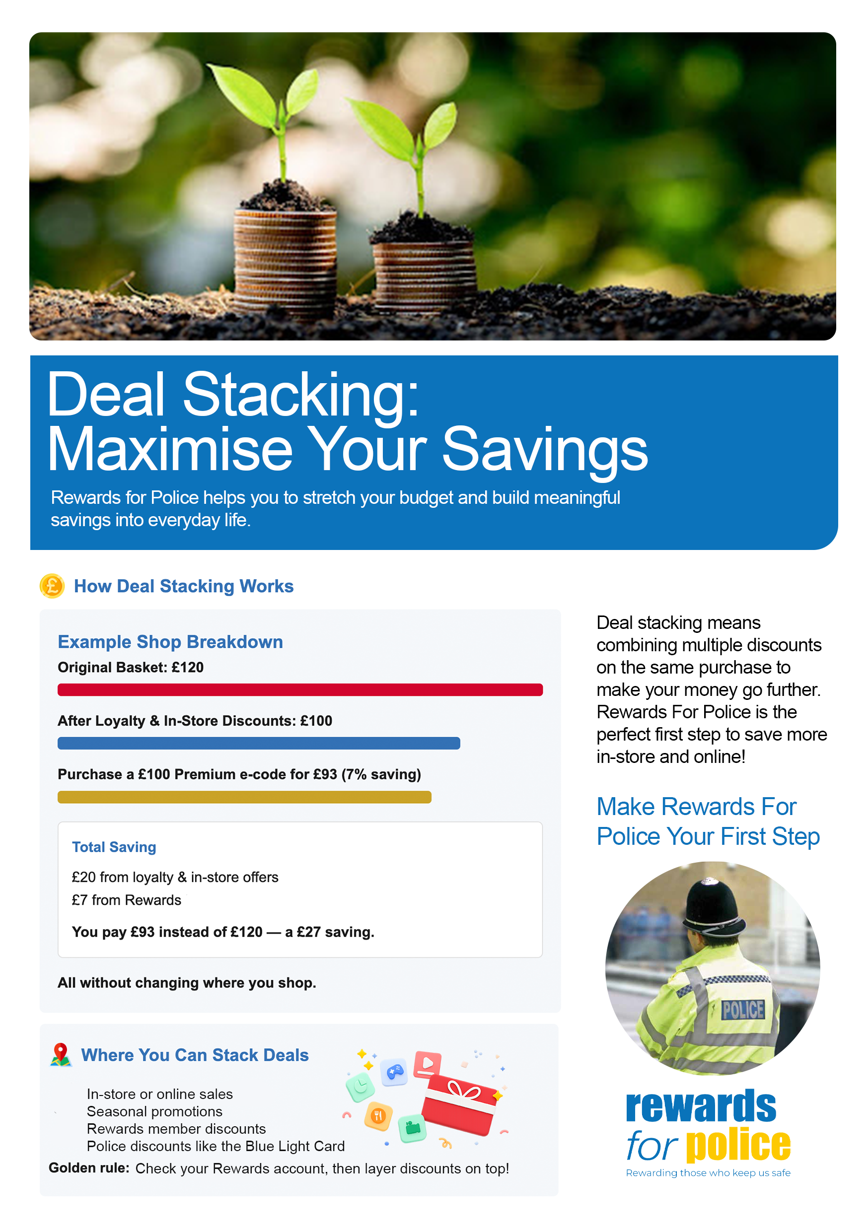 (Click Tile to view main website). National Rewards Scheme for all members of the Police, with numerous offers from all the major supermarkets, restaurants, and high street retailers. Free to sign up. (Initially please use work email address for verification purposes and this will then be deleted once completed). Optional fee £5 per annum (less than £0.42 a month) for the Premium Membership Rewards, which will open further offers which includes the e-code saving for Morrisons.