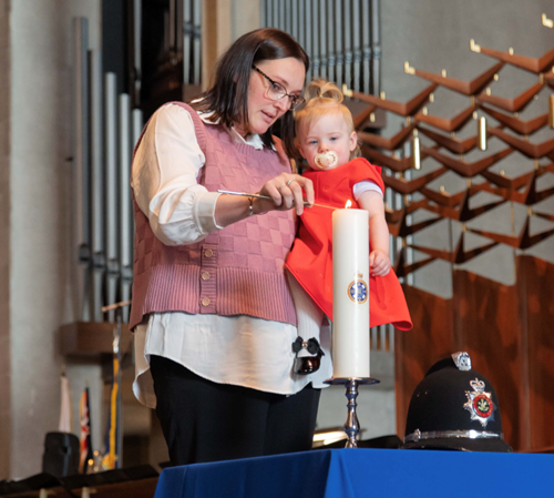 This year, Kelly Swindells and one-year-old Mabel, the daughter and granddaughter of West Midlands DC Michael Swindells QPM, 44, who died on 21 May 2004 when he was stabbed by a suspect he had been pursuing, lit the candle representing England.