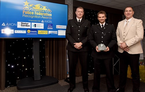 PC Jack Thompson (pictured middle) was recognised at the first ever Cumbria Police Federation Recognition Awards on Thursday night for his outstanding work and will now be the force's representative at the National Police Bravery Awards in July.