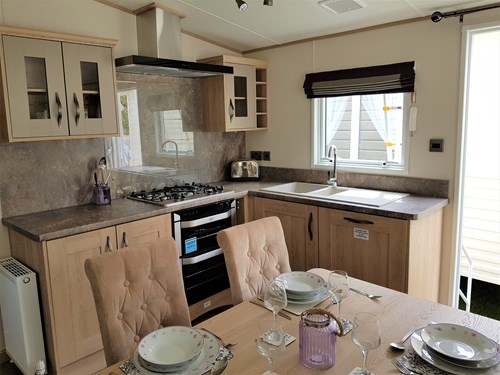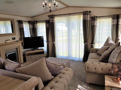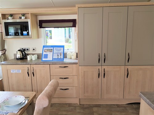 The holiday home is located in an exclusive mews of holiday homes surrounded by trees, creating the perfect tranquil setting for a break away. The 3 bedroom mobile home in the Belfry area of the park is a light and well laid out accommodation with a neutral colour scheme to help you unwind.