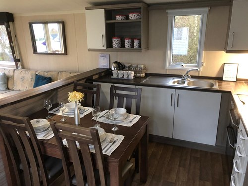 The lodge is a luxurious property that benefits from features such as dishwasher, washing machine and wine fridge. There is a large wrap-around decking with rattan sofa and table and chairs.