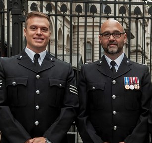 The Queen’s Gallantry Medal is awarded to Sgt Michael Hooper and PC Stephen Quartermain (pictured left to right) for their attempted rescue of five people following a helicopter crash at the Leicester City Football Club stadium in 2018.