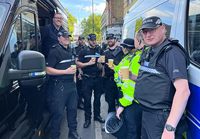 Officers grabbing some much-needed refreshments from one of our welfare vans.