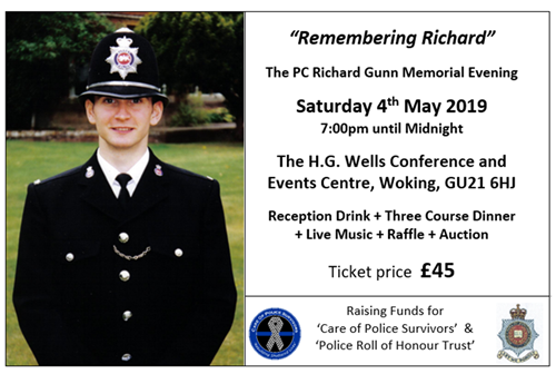 The PC Richard Gunn Memorial Evening Charity Ball will be held on Saturday 4th May 2019 at the H.G.Wells Conference and Events Centre in Woking. The venue is a few minutes walk from Woking Railway Station and a short drive from the M25/M3 junction.