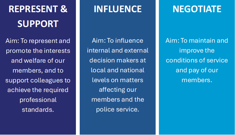 Established by the Police Act 1919 its purpose is to represent officers, up to and including the rank of Chief Inspector, in all matters affecting their welfare and efficiency.