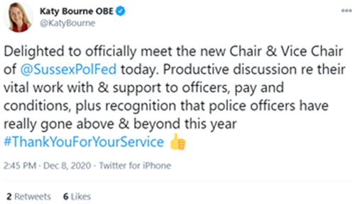 Talking after the meeting, Daren said: "Sussex Police Federation would like to thank Katy for her tweet showing her recognition of officers' hard work “going above and beyond”, particularly throughout the policing of this pandemic.