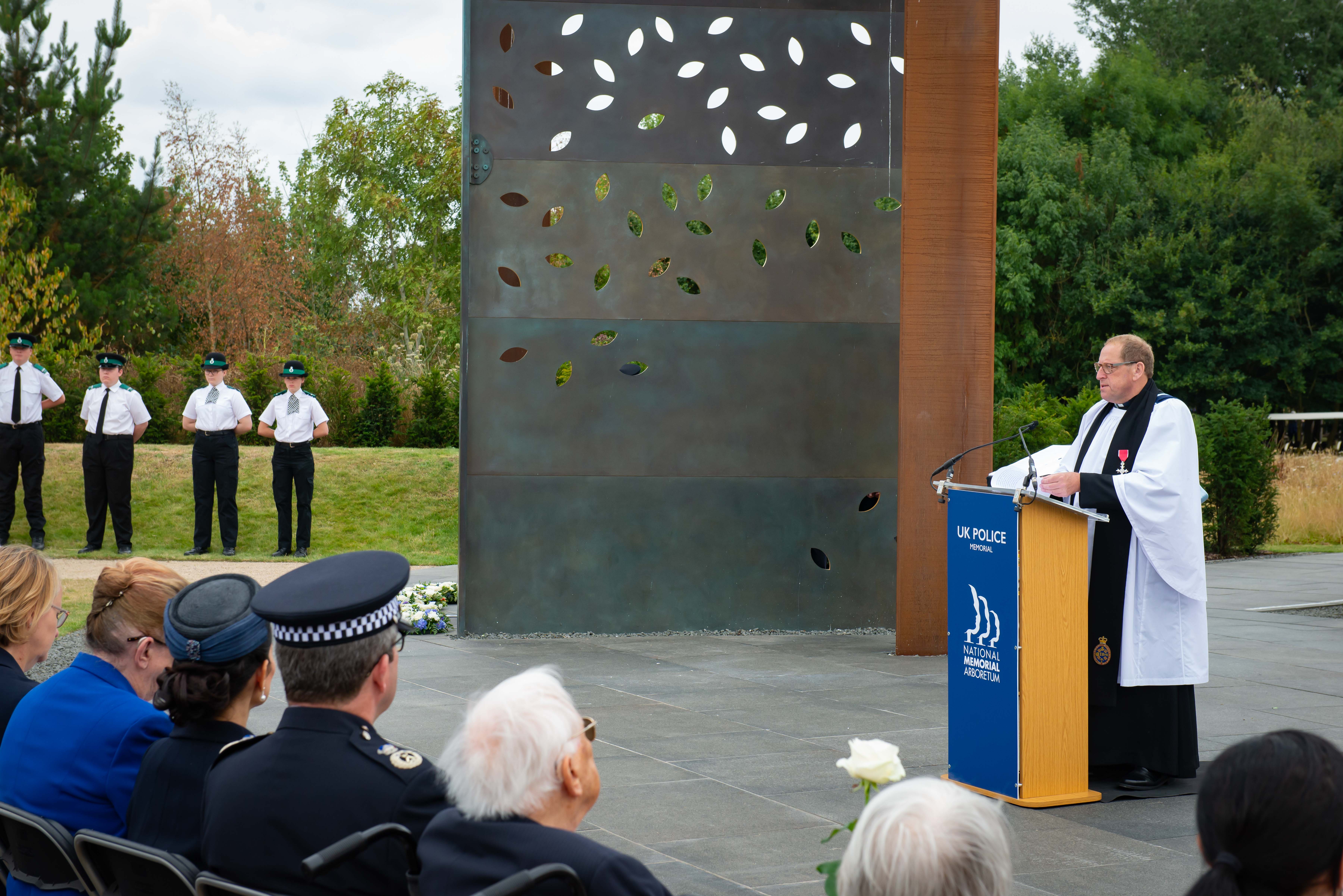 Police chaplain David Wilbraham addresses the congregation at a service in the summer which marked the first anniversary of the unveiling of the UK Police Memorial. Photo courtesy of Anderson Photography.