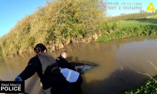 The Worcester-based officers responded to a 999 call from the driver, who is in her 40s, and found she was already 10 metres downstream and submerged underwater at Walcot Lane ford at Drakes Broughton near Pershore.